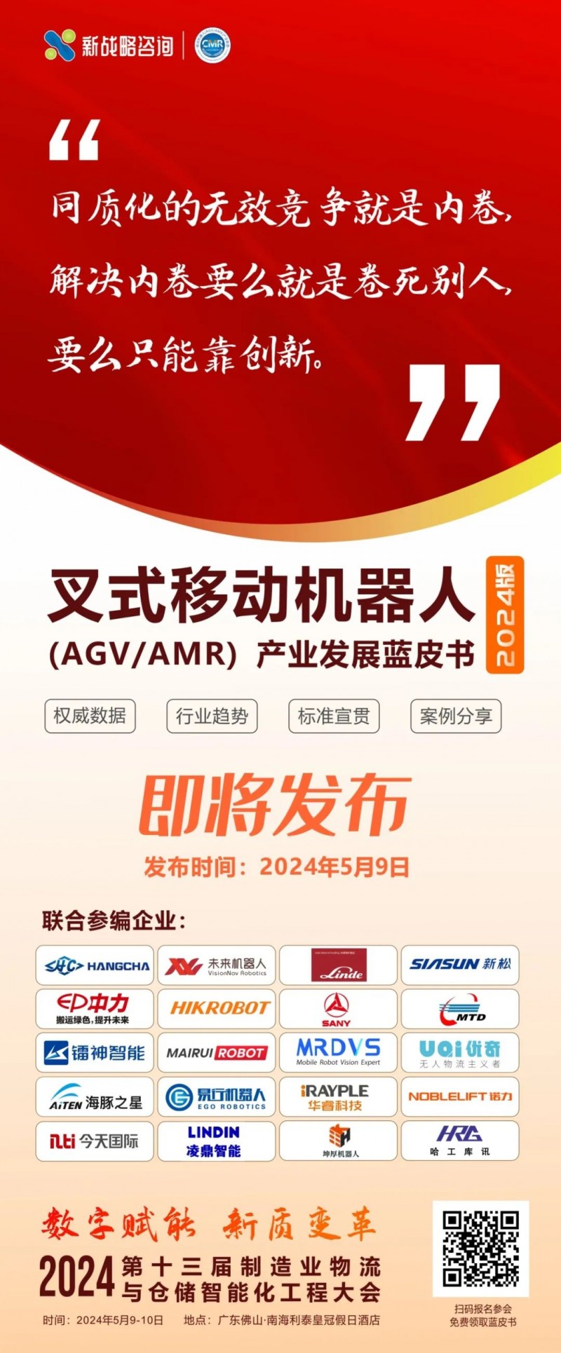 2024年,为了更好地探析当前无人叉车市场最新发展情况及趋势,推动无人叉车深入应用,彰显行业品牌力量,由CMR产业尊龙凯时主编,杭叉智能、未来机器人、林德、新松、浙江中力、海康机器人、三一机器人、机科股份、镭神智能、迈睿机器人、迈尔微视、UQI优奇、海豚之星、易行机器人、华睿科技、上海诺力智能、今天国际、凌鼎智能、坤厚智能、哈工库讯等20家无人叉车主流企业联合编制的《叉式移动机器人(AGV/AMR)产业发展蓝皮书(2024版)》将在5月9日举办的“inktype="text" imgurl="" imgdata="null" data-itemshowtype="0" tab="innerlink" data-linktype="2" hasload="1">第十三届制造业物流与仓储智能化工程大会暨第二届全球叉式移动机器人峰会”上正式发布,参会人员可现场领取蓝皮书纸质版一份,敬请期待!
