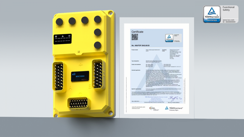 近日,浙江科聪控制技术有限公司(以下简称"科聪")的安全移动机器人控制器MSC5000荣获全球权威认证机构德国莱茵TÜV集团(TÜV Rheinland)颁发的功能安全认证证书。这款控制器是全球首款通过SIL3、PLe 认证的移动机器人安全控制器,其安全等级与性能均处于世界领先水平,标志着科聪在机器人安全控制领域的创新突破。
